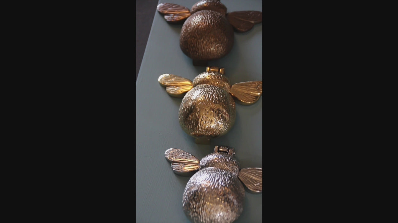 The door knocker works by striking the body of the bee against the strip of plated brass that is attached to the door. The weight of the bee ensures that a good knock resounds from the door knocker.