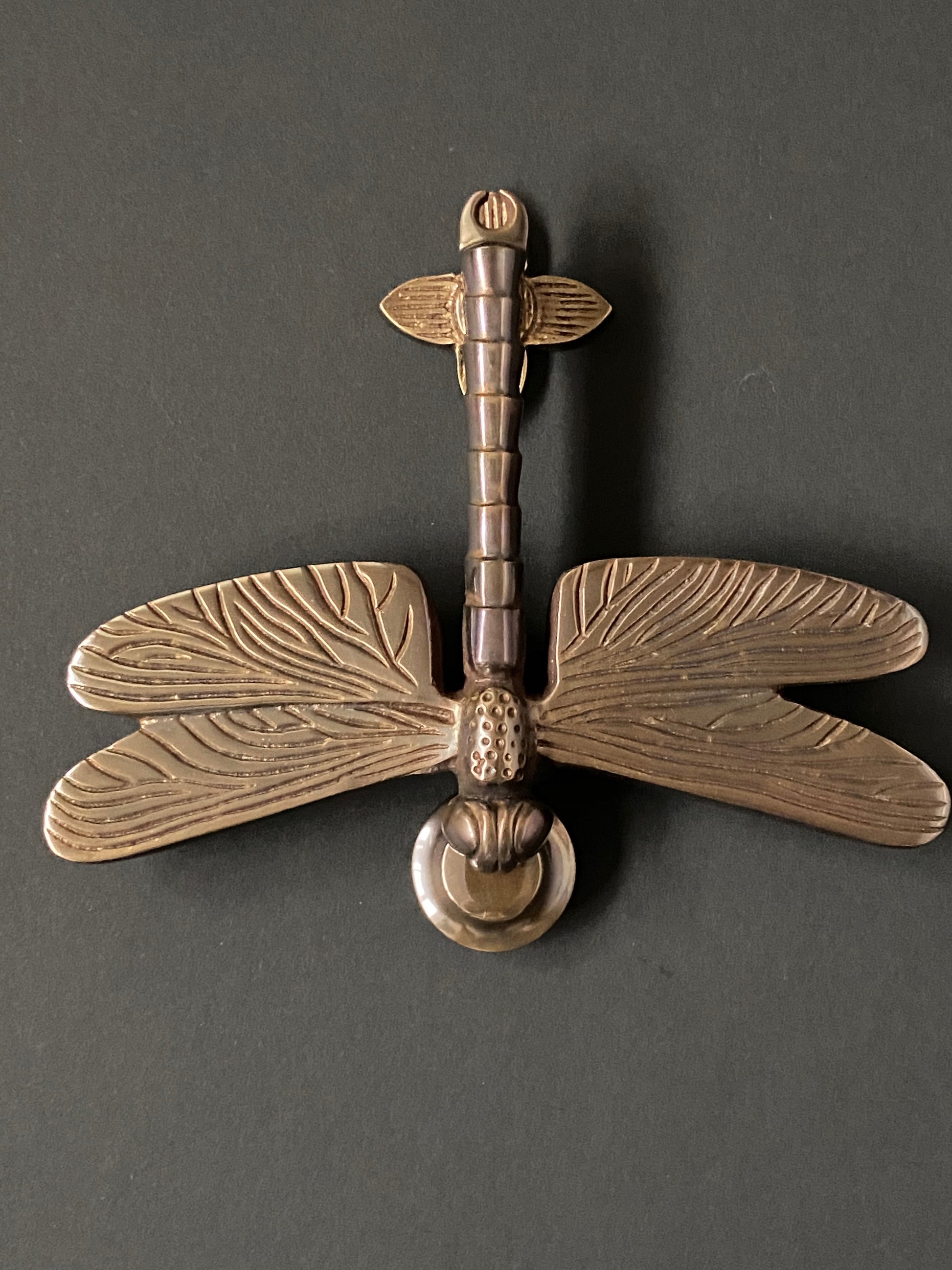 The dragonfly's wings are intricately detailed and hover over the door while the head of the dragonfly is used to rap onto the striking plate. The door knocker is hinged at the end of the tail. The head and tail are the only parts that touch the door.